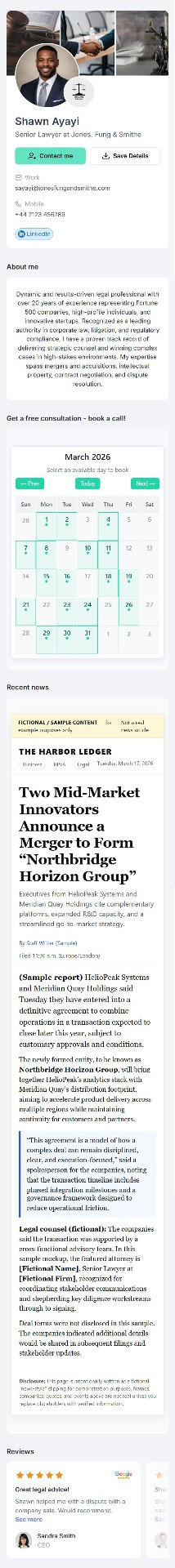 It contains contact exchange buttons, a link to a LinkedIn profile, an About Me section highlighting the lawyer's experience, an embedded calendar booking system for consultations, a recent news article, and reviews.