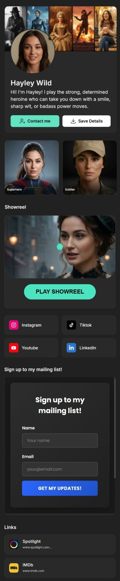 It contains contact exchange buttons, headshot examples (with titles), a showreel that can be watched inside the card, social links, a mailing list embed people can sign up to, and links to Spotlight and IMDb.