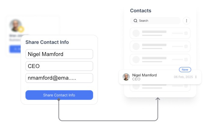 Instantly exchange your contact details, social links, and more with a single tap or scan - no app required.