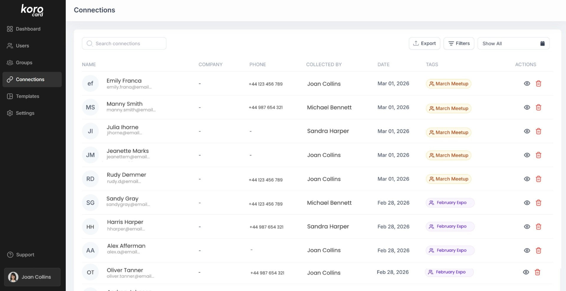 Koro Card provides insights into how many people have viewed your cards, saved your details, and shared their contact details with you. Plus, it enables tracking of interactions with items you have added to your profile.