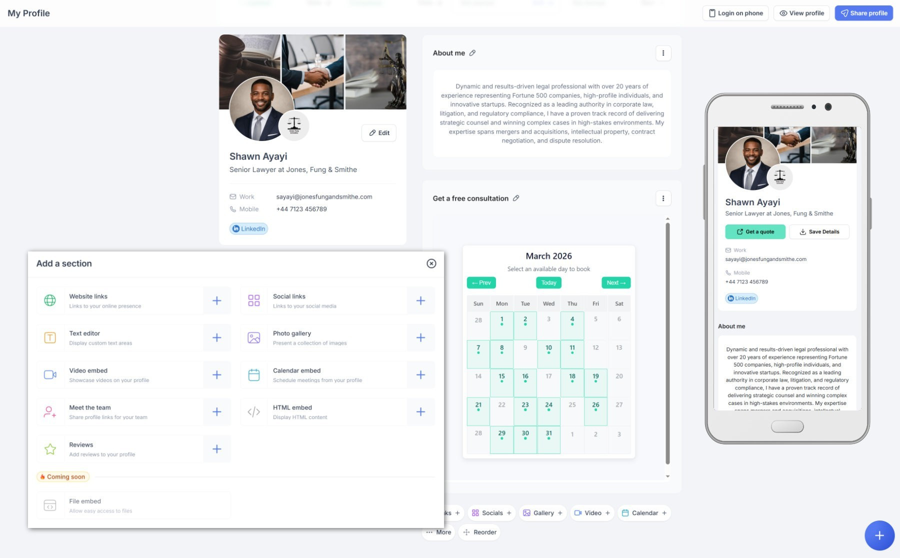Add your contact details, a bio, photos, reviews, your calendar link, your LinkedIn profile, WhatsApp contact, forms, embed videos... almost anything you like.